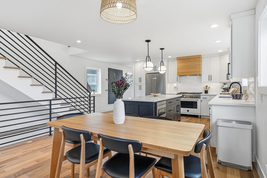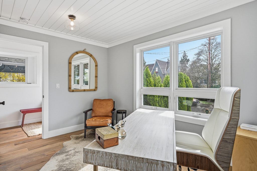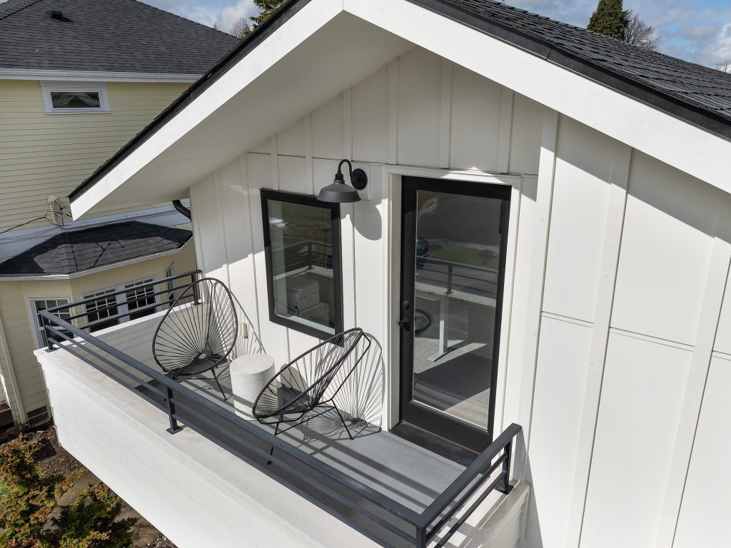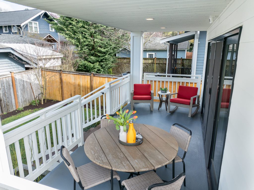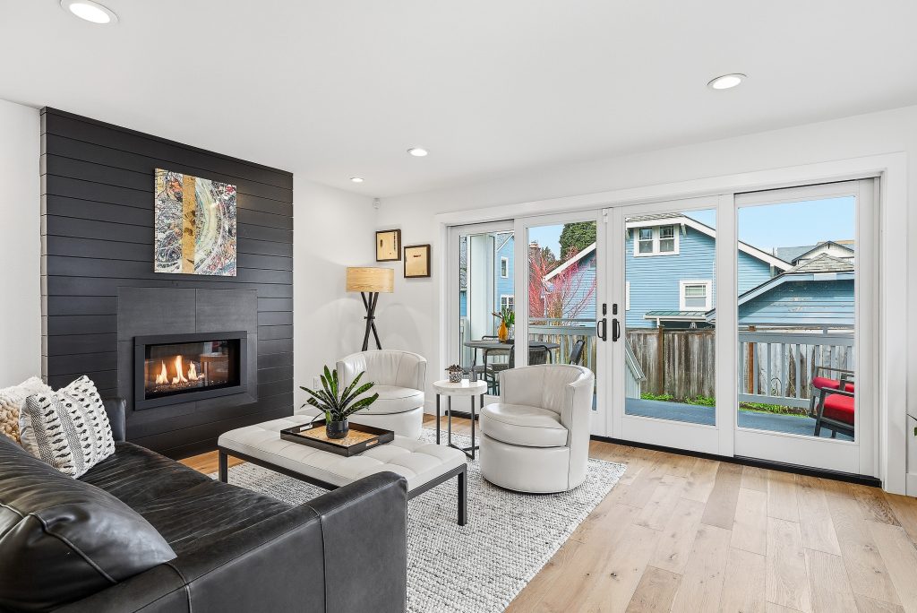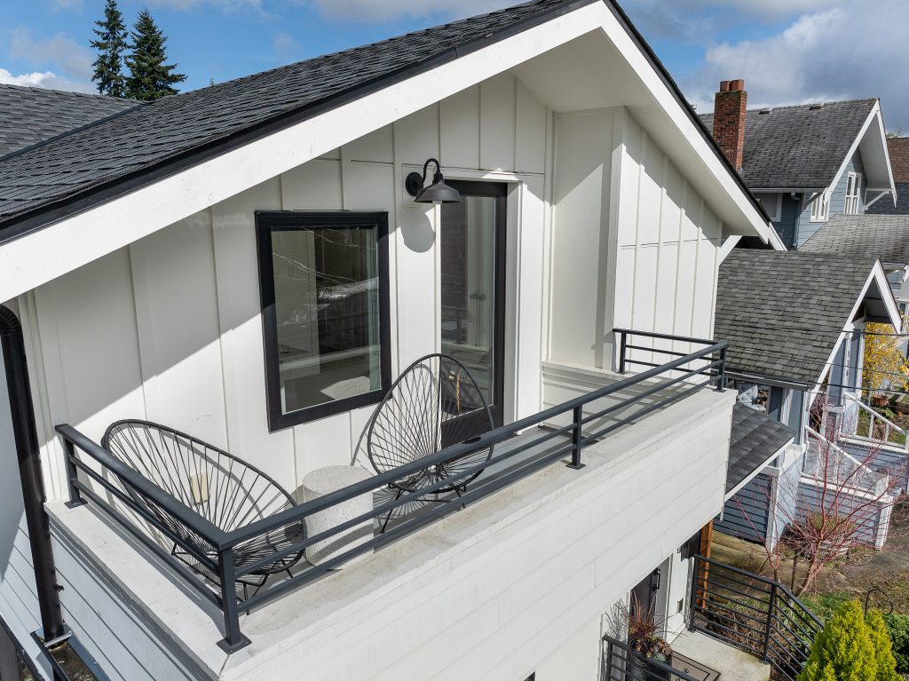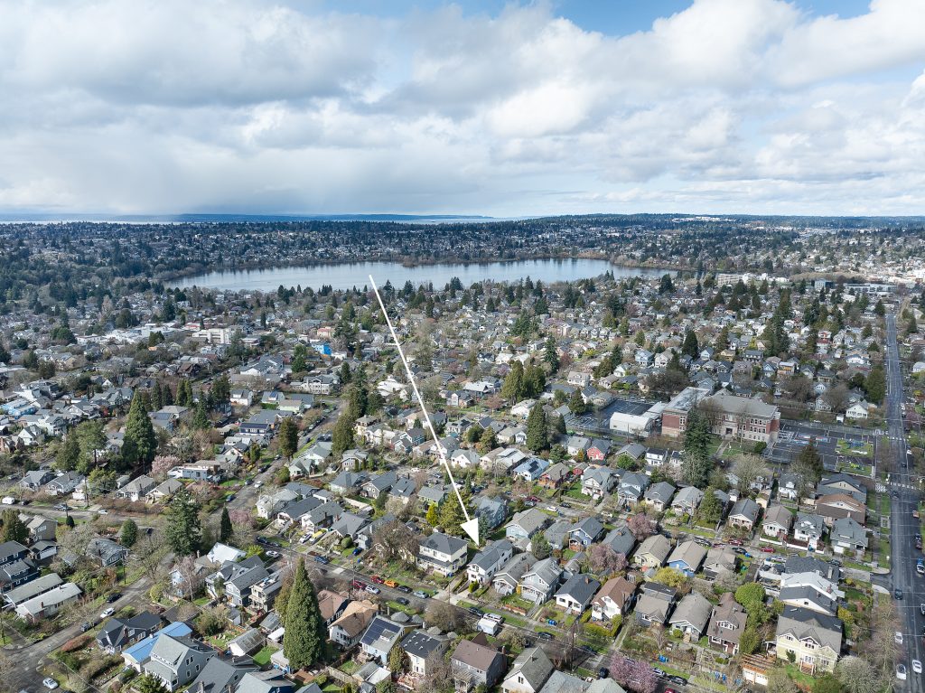 This thoughtfully designed home built in 2020 lives large on its urban lot, a compelling opportunity in this sought-after neighborhood. Clean architectural lines combined with timeless, high-quality materials delivers an open layout that is both functional and bright. The kitchen and adjoining living spaces form the natural heart of the home. A generous island with breakfast bar, spacious dining area, and gas fireplace anchor the great room living area, while the inviting back porch extends the space for outdoor meals and relaxed evenings. A refined black-and-white palette is warmed by white oak flooring, staircase, and a striking white oak–wrapped vent hood for the 5-burner Bertazzoni gas range. The main-floor bedroom works beautifully as a south-facing office, complemented by a nearby powder room. Upstairs, three desirable bedrooms include a luxurious primary suite with spa-like bath, and the south-facing bedroom features a balcony. The garage—with EV charger and storage nook—connects directly to a lower-level family room, storage closet and adjacent guest suite, offering flexible living options. Just enough yard space allows for gardening or a moment of green. An exceptional location two blocks to McDonald International Elementary (option) School, and just minutes to Tangletown dining, Green Lake Park, grocery stores, UW, and transit options.